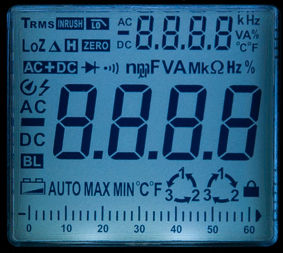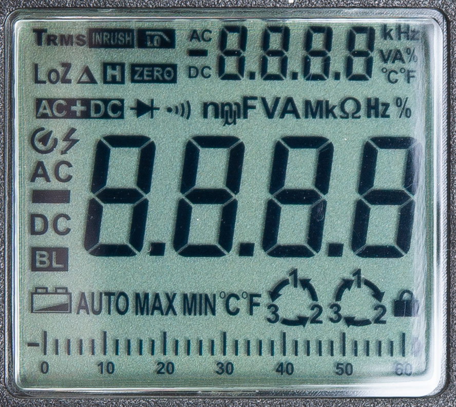| Особенности | Регистрация Макс/Мин/Пиковых значений. Удержание показаний (HOLD). Режим относительных значений (REL). Фильтр НЧ (LPF). Низкоомный вход LoZ. Бесконтактный детектор напряжения (NCV). Регистрация бросков пускового тока. Измерение чередования фаз 3-х фазного двигателя. Режим измерения микротока AC/DC. Автовыключение (АРО- 15 минут. Коэффициент заполнения импульсов 0,1...90 %. Категориям безопасности CAT IV 600 В |