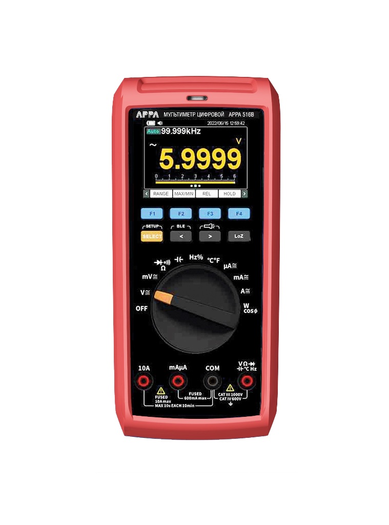 | Особенности | Измерение электрической мощности (до 2,5 кВт), рабочий диапазон частот 40 Гц …1 кГц (ACV/ ACA). Измерение температуры в диапазоне -50…+1000 °С. Вход «mA» для слаботочных измерений (0…600 мА). Регистрация МИН/ МАКС/ AVG (с метками времени), пиковых значений (Peak от 1 мс). Относительные измерения REL, фильтр НЧ (LPF), функция LoZ. Режим измерения петли тока (LOOP), диапазон «4-20 мА», индикация в %. Внутренний таймер, часы, календарь. Режим удержания показаний (HOLD). Цветной ЖКИ с подсветкой (макс. «60.000», 3 изм./с), граф. линейная шкала (61 элемент). Категория защиты 1000В кат III/600В кат IV. Питание 3 батареи 1,5В (тип ААА). Встроенный магнитный держатель, с/д фонарик подсветки. Сигнализация об ошибке коммутации изм. проводов на входе (Mis-Lead Alert). Беспроводный радиоинтерфейс Bluetooth (ver. 4.0), поддержка моб. устройств на базе Android/ iOS (планшет, смартфон), установка бесплатного приложения / Multimeter BLE4.0, подключение к ПК |