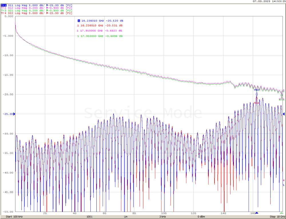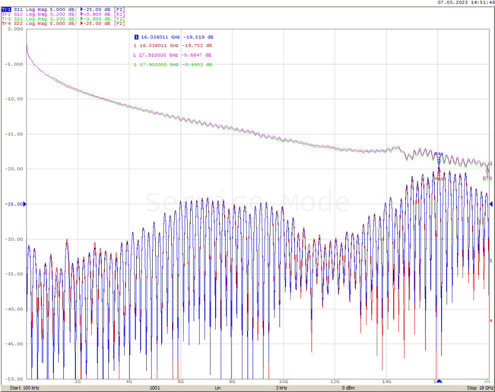 | Особенности | КСВН не более 1,3. Вносимые потери не более 0,8 дБ. Зависимость фазы от температуры (от минус 40 С до плюс 40 С), 0,055%.Изменение фазы от изгиба (минимальный радиус изгиба 51 мм), не более 2 градусов |