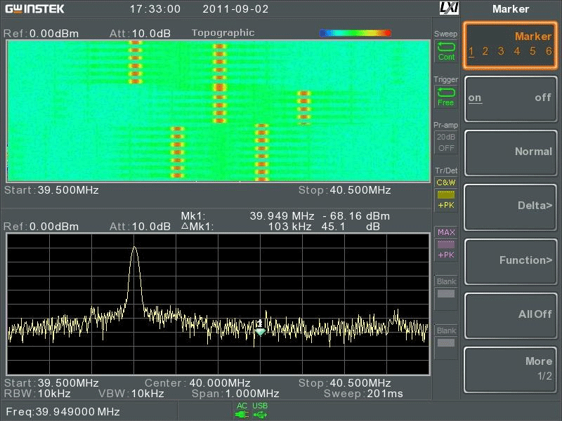 | Особенности | Предварительное тестирование на ЭМС (фильтры 200 Гц, 9 кГц, 120 кГц, 1 МГц). Детекторы ЭМС, квазипиковый и средний. Измерительный функции - точка P1dB, фазовый шум, ACPR, OCBW, N-dB, дрожание фазы, мощность в канале соотношение мощностей в смежных каналах, TOI, CNR, CSO, CTB, измерение полосы по уровню, анализ модуляции, гармоник и др. Демодулятор АМ/ЧМ/ЧМн/2-ЧМн/АМн. Маркерные измерения, запись спектрограмм с временными метками Опции - батарейное питание, интерфейс GPIB. |