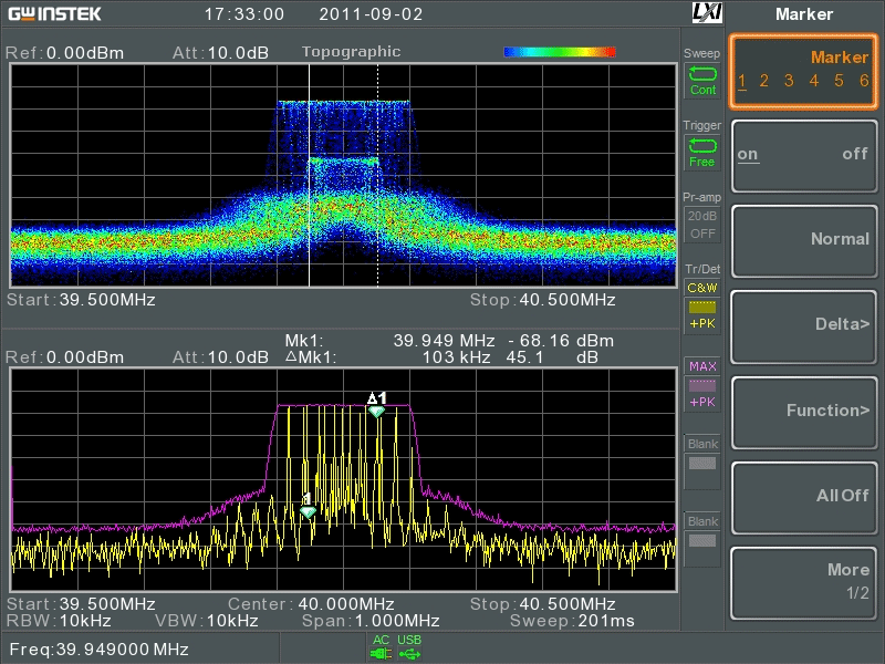 | Особенности | Трекинг генератор, диапазон частот 100 кГц - 3,25 ГГц. Предварительное тестирование на ЭМС (фильтры 200 Гц, 9 кГц, 120 кГц, 1 МГц). Детекторы ЭМС, квазипиковый и средний. Измерительный функции - точка P1dB, фазовый шум, ACPR, OCBW, N-dB, дрожание фазы, мощность в канале соотношение мощностей в смежных каналах, TOI, CNR, CSO, CTB, измерение полосы по уровню, анализ модуляции, гармоник и др. Демодулятор АМ/ЧМ/ЧМн/2-ЧМн/АМн. Маркерные измерения, запись спектрограмм с временными метками Опции - батарейное питание, интерфейс GPIB. |