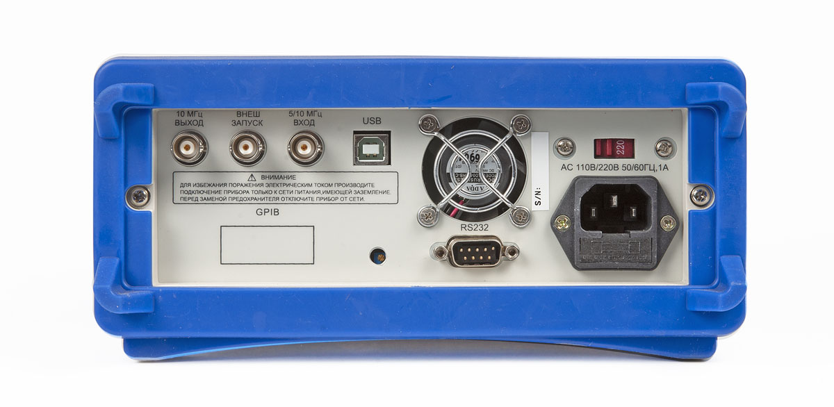 На задней панели частотомеров расположены разъем шнура сетевого питания, гарантийная пломба, выход опорного генератора, входы внешнего запуска и внешнего опорного генератора, а также наклейка с указанием используемой в частотомере опции опорного генератора.
