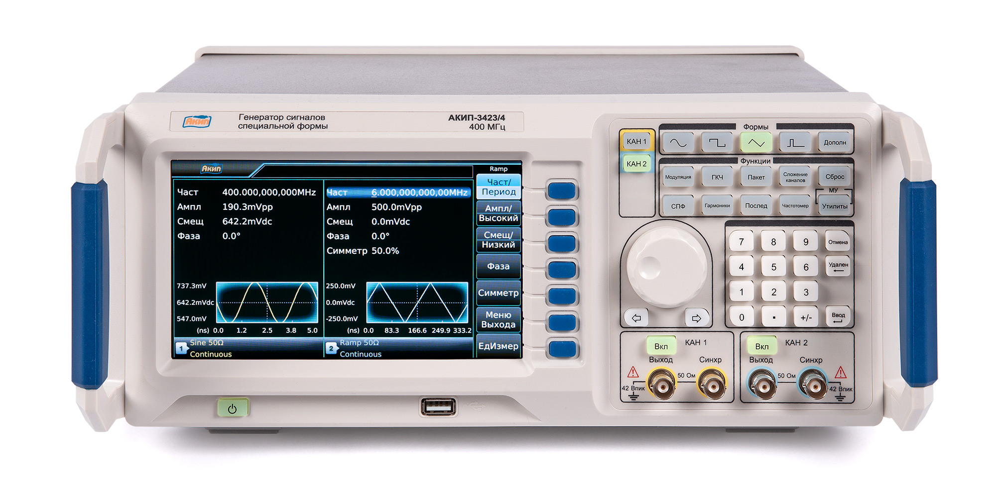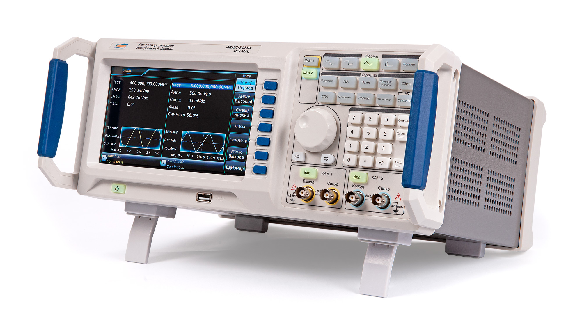 | Особенности | Прямой цифровой синтез (DDS), дискретизация до 1,2 ГГц. Режим формирования сигнала произвольной формы с дискретизацией до 200 МГц, память 32 МБ. Встроенные сигналы специальной формы (165 видов). Формирование выходного сигнала путем задания гармоник. |