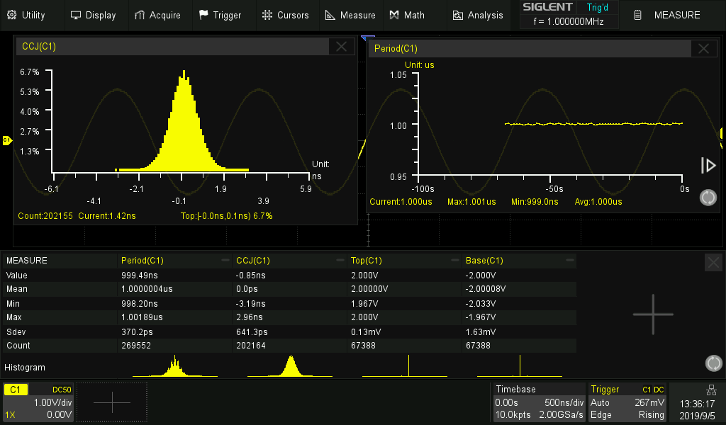 | Особенности | Полоса пропускания 500 МГц доступна только при следующих установках активных каналов, КАН1+КАН3, КАН1+КАН4, КАН2+КАН3, КАН2+КАН4. Переключаемая разрядность АЦП, до 10 бит в полосе пропускания до 100 МГц и длине памяти 100 МБ. Высокая скорость обновления экрана до 500.000 осц./сек. Режим сегментированной памяти. Режим HISTORY. Интерполяция - Sin X/х, линейная. Автоматические (более 50-и параметров) и курсорные измерения. Математические функции, БПФ. Режим «Поисковая машина/ Search» для поиска событий по условиям заданным пользователем. Синхронизация и декодирование сигналов, стандартно, I2C, SPI, UART/RS232, CAN, LIN, опционально, I2S, MIL-1553, FlexRay, CAN FD. Опция - логический анализатор 16 каналов. Опция - функциональный генератор до 50 МГц. |
