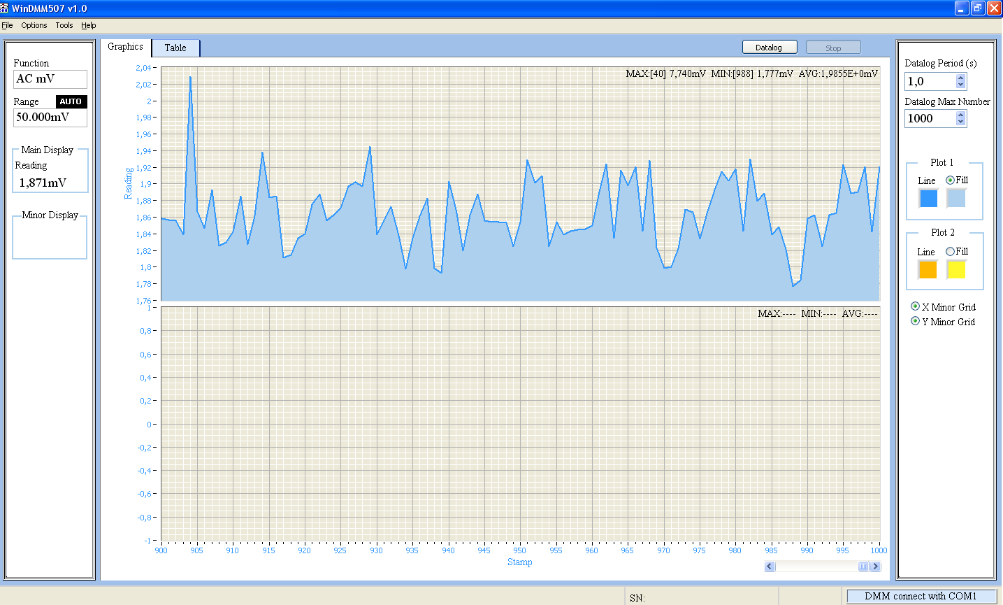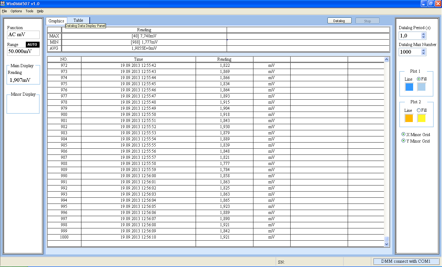 - Документирование. Возможности документирования характеризуются возможностью записи результатов измерений во внутреннюю память прибора (100 ячеек) или передаваться на ПК для подготовки отчетов. При помощи штатной программы WinDMM507 возможно осуществлять он-лайн регистрацию данных, записывать данные в таблицу, строить график изменения параметра во времени, экспортировать отсчеты в формат Excel.