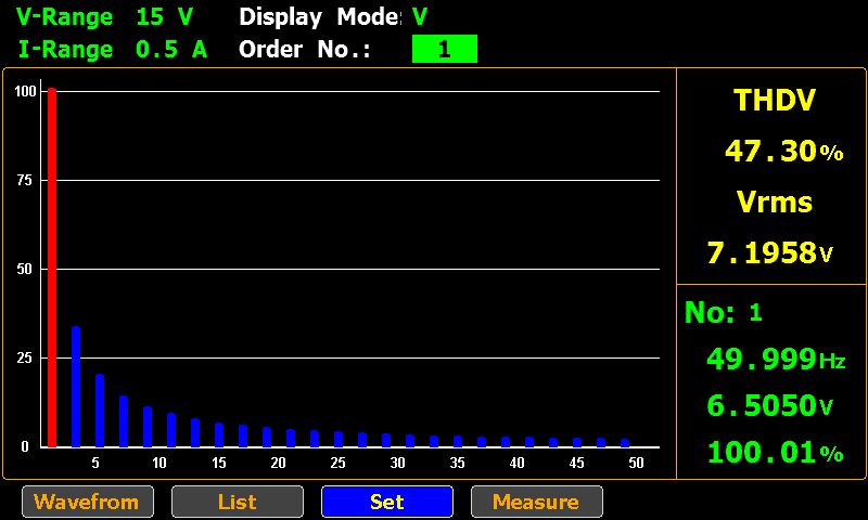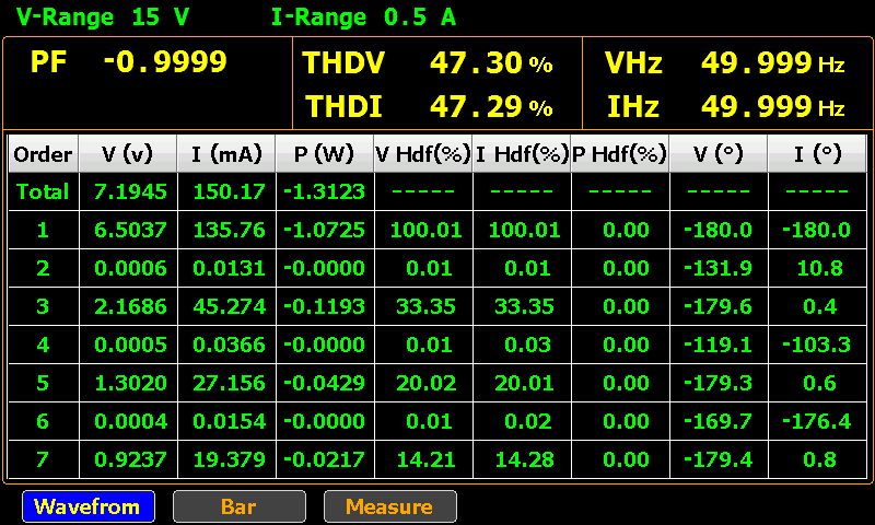 В функции гармонических измерений результаты каждой их гармоник основного сигнала могут быть отображены в формате диаграммы, которая представляет собой прямоугольные зоны (столбцы –рис.2г), высоты которых пропорциональны величинам конкретных частотных компонент. Доступна для анализа каждая из интересующих гармоник и/или суммарный коэффициент гармонических искажений. Кроме того, полученные результаты измерений по каждой из гармоник могут быть представлены в виде сводной таблицы (рис.2д) с указанием соответствующих значений: напряжение, ток, мощность, КНИ (напряжение/ ток), коэф. реактивной мощности (DPF/Distortion Power Factor), сдвиг фаз (угол напряжение/ ток).
