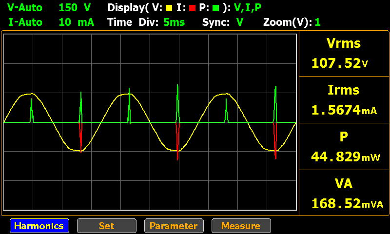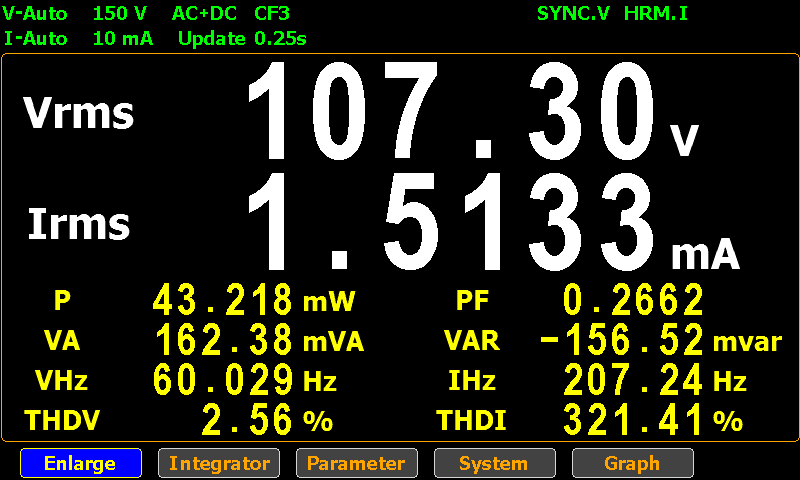 Номинальное входное напряжение, непосредственно подаваемое на вход GPM-78310, составляет 600В (макс. 1000В), а входной ток до 20A (макс. 30А). Нижний предел измерения тока составляет 5 мА (разрешение до 0,1 мкА), а макс. разрешение по мощности составляет 0,1 мкВт. Предусмотрена возможность выбора значения коэф. амплитуды U/I (крест-фактор). Коэффициент CF может быть задан CF=3 (для уровней =½ диапазона измерений CF может быть иметь значение 6 или 6А). Оператору доступен выбор требуемого режима в соответствии с измерительной задачей (AC+DC, AC, DC, V-MEAN), что обеспечивает отображение соответствующих параметров при анализе мощности, в том числе - напряжение (Vrms / Vac / Vdc / Vmn / V-Pk / V-PK ), силу тока (Irms / Iac / Idc / I-Pk / I-pk частота (VHz/ IHz), мощность (P/ P /P'pk/P-pk), крест-фактор (CFV/ CFI), полная мощность (VA), реактивная мощность (VAR), коэффициент мощности (PF), угол сдвига фазы U/I (DEG), суммарный коэф. гармонических искажений/ КНИ (THDV/ THDI), максимальный коэф. передачи тока (MCR), а также имеет функцию математических вычислений (MATH). Особенностью модели является возможность измерения сверхмалых значений токов/ мощности с целью анализа состояния электропотребителей. В первую очередь измеритель предназначен для количественной оценки потребления энергии в режиме сна (standby) или измерения флуктуаций потребления электроэнергии ЭУ малой мощности, обеспечивая при этом широкий диапазон (U/ I/ P), высокую точность и разрешение.