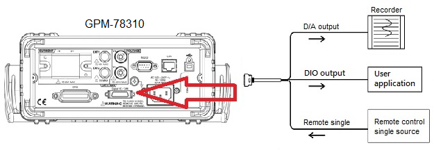 Для организации управления внешними сигналами или записи данных на внешний регистратор в GPM-78310 предусмотрен дополнительный интерфейс Digital I/O (DA4- опция), который устанавливается только на заводе (вариант исполнения). При наличии данного интерфейса прибор может быть подключен к внешнему программируемому контроллеру (PLC/ регистратор данных) с целью реализации автоматических измерений или для задач длительной записи на внешнее устройство.