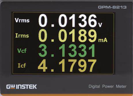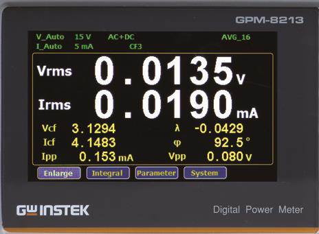 По сравнению с ваттметрами той же категории, GPM-78213 обеспечивает более разнообразные возможности и функции измерений, включая такие параметры, как напряжение, ток, частота, активная мощность, полная мощность, реактивная мощность, коэффициент мощности, коэф. амплитуд и Суммарные гармонические искажения (THD%). Кроме того, GPM-78213 оснащен режимом интегрированных измерений при электропитании тестируемого устройства (анализ мощности и потребляемого тока во временной области). Пользователи могут сами задать временной интервал для выполнения интеграции при измерениях перетекающей от источника к нагрузке мощности или вычислить усредненное значение мощности (Pср), разделив полученный результат на время теста.
