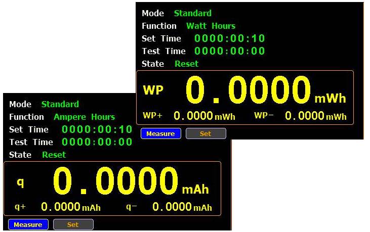 - Функция интегрирования: W-h (мощность по времени/ Энергия) / A-h (ток по времени/ Ёмкость)