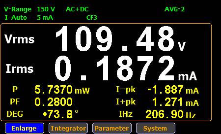 Обычный режим: в процессе измерений на экране отображаются четыре заданных пользователем параметра, что вполне достаточно для применения ваттметра в качестве СИ выходного тестирования на производственной линии (контроль качества).