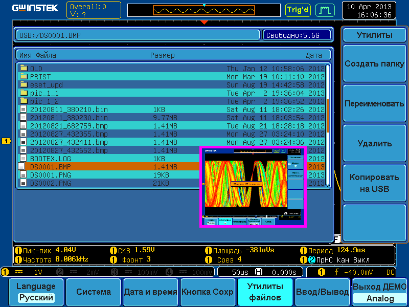 Осциллографы серии GDS-72xxx снабжены всем для удобного документирования и просмотра сохраненных данных. В меню прибора можно просматривать ранее сохраненные файлы. В таблице указаны: имя файла, тип, размер и дата создания. Имя файла можно редактировать непосредственно в приборе, также как создавать и редактировать папку файлов. Файлы, сохраненные во внутренней памяти прибора можно переносить на USB-диск. Помимо этого, справочные файлы и файлы настроек, сохранённые во внутренней памяти, могут снабжаться множеством индивидуальных меток. Метки используются для опорных осциллограмм и значков файлов настроек. Главное новшество, примененное в новой серии – это предпросмотр сохраненных изображений без открытия самого файла (рис. 13). Достаточно навести курсор выбора на интересующий графический файл (.bmp) из числа сохраненных в памяти, - при этом в отдельном уменьшенном окне автоматически отображается форма сохраненного сигнала (на рис.13 - в розовой рамке). Это позволяет исключить ошибку оператора при выборе определенного файла из большого перечня сохраненных данных.