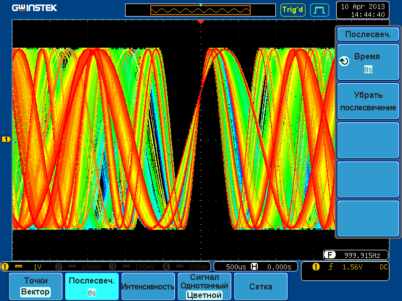 Обработка сигнала осуществляется с применением новой технологии аналогового послесвечения (рис. 3). Благодаря этой технологии, динамично меняющийся сигнал будет выглядеть чистым, как на аналоговом осциллографе. Сигнал может отображаться как в однотонном, так и в цветном виде. Цветной режим позволяет определить степень повторяемости событий, редкие события отображаются, синим цветом, частые события отображаются красным цветом (рис. 3). К достоинствам отображения следует добавить большой контрастный дисплей с диагональю 20 см и разрешением 800х600. Высокое разрешение позволяет рассмотреть детали сложных сигналов. Полупрозрачные окна при проведении измерений позволяют наблюдать на экране максимум информации.