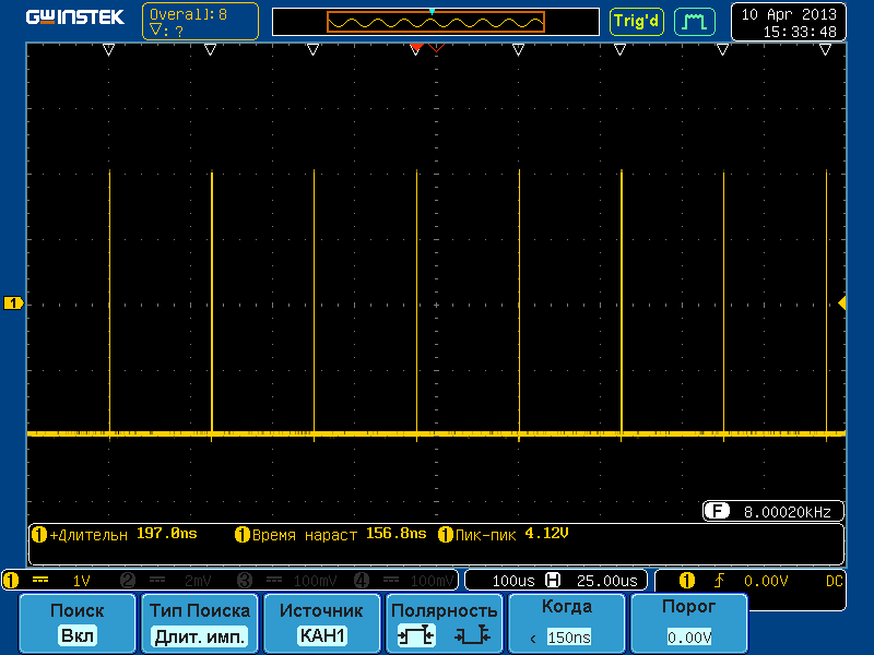 - При выборе типа поиска “По длительности” происходит обнаружение всех импульсных сигналов, длительность которых удовлетворяет заданным условиям (Рис. 4).