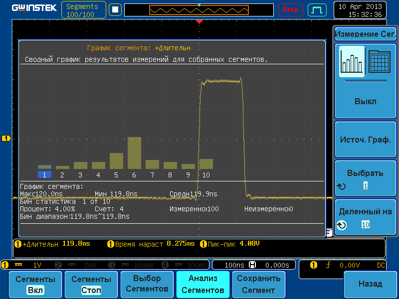 Режим “Сегментированной памяти” позволяет на полную использовать всю доступную длину памяти осциллографа. В сегментированном режиме вся осциллограмма составляется из определенного количества сегментов фиксированного размера. Количество таких сегментов задается пользователем и ограниченно 2048 сегментами. Каждый из сегментов можно использовать отдельно для математической обработки и измерения.