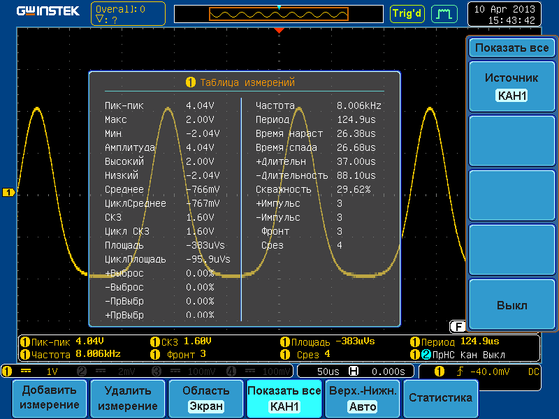В осциллографах серии GDS-72xxx реализована возможность проведения 36 автоматических измерений. Автоизмерения сгруппированы по трем типам: амплитудные, временные и измерения задержки. Как уже говорилось выше пользователь может настроить вывод до восьми измерений под основным экраном или вывести все измерения в одном окне. Полупрозрачное окно измерений позволяет проводить максимум измерений в сигнале, сохраняя при этом контроль сигнала (Рис. 8).