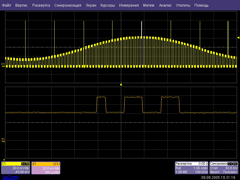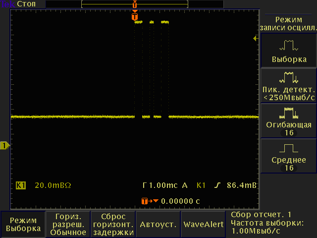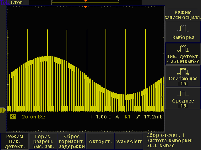 Включим режим пикового детектора – четко видны положительные выбросы, зафиксированные осциллографом.