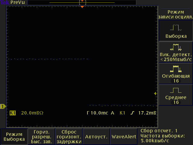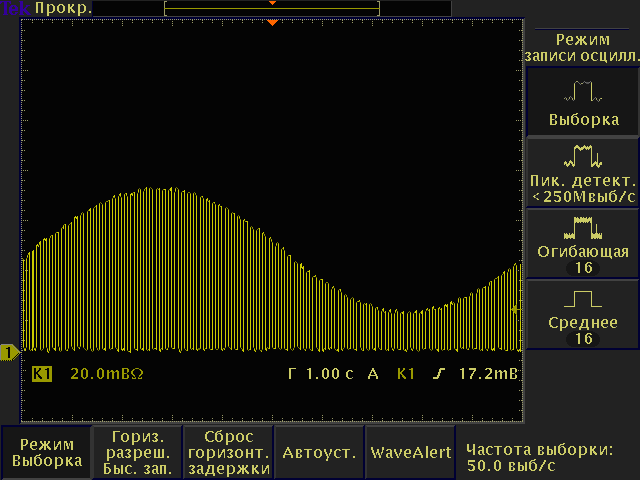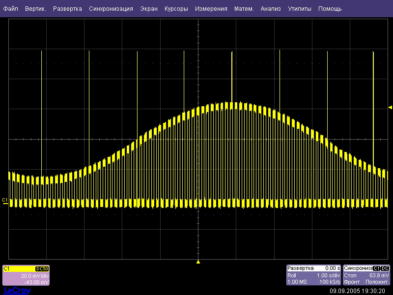 Переведем Tektronix в режим развертки 1 с/деление, осциллограф обеспечивает сбор информации в режиме стандартной выборки. Картинка приведена внизу. Никаких выбросов не видно.