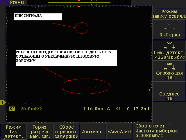 2. Пиковый детектор предназначен только для индикации наличия пиков сигнала в его структуре. Длина памяти TDS-3000 серии составляет 10000 точек, а отображаемая часть экрана - не более 640 точек, для согласования режимом ввода в память и вывода на экран, при котором бы не терялись экстремальные значения сигнала и предназначен пиковый детектор. Но пиковый детектор не предназначен для идентификации формы пика и измерения его параметров из-за малой частоты дискретизации.