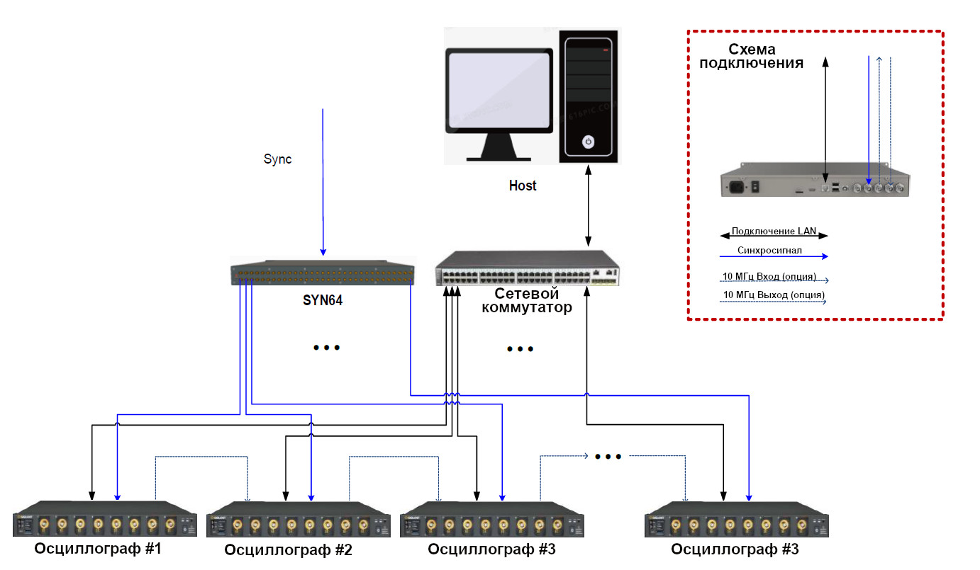 Осциллографы серии АКИП-4156 поддерживают внешний блок коммутации SYN64 для синхронизации и объединения до 64-х осциллографов. Что дает возможность получить единую 512 канальную систему для захвата, сбора и обработки данных.