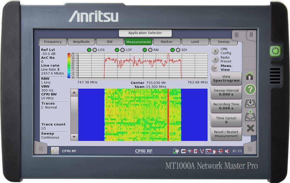 Новый РЧ-модуль с CPRI-интерфейсом поддерживает удаленные радиоблоки всех ведущих производителей. С его помощью система Network Master Pro MT1000A может использоваться для проведения РЧ-измерений на LTE-сетях через волоконно-оптический CPRI-канал без необходимости взбираться на вышку, что занимает время и связано с дополнительными затратами. РЧ-модуль включает два порта SFP и позволяет осуществлять измерения в следующих режимах: CPRI Spectrum (спектр), CPRI Spectrogram (спектрограмма), SFP Data (параметры приемопередающего модуля), CPRI Layer 2 Alarms (аварийные сообщения второго уровня), Optical Power (мощность оптического сигнала).