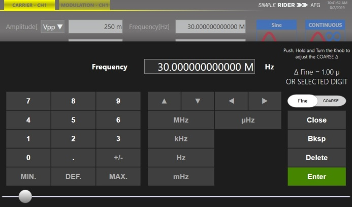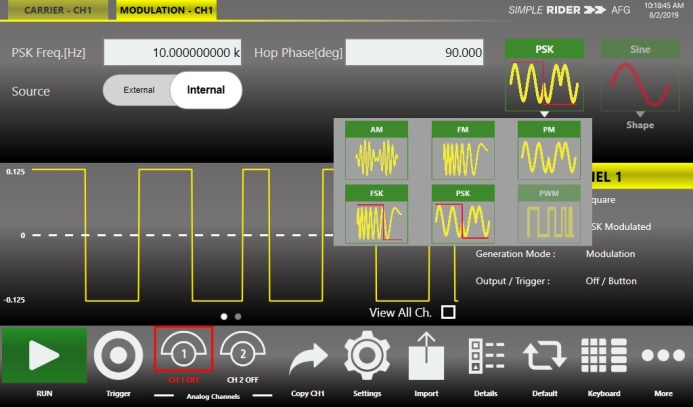 Все элементы управления и настройки всегда находятся в одном касании: достаточно провести пальцем по экрану, чтобы переключить канал, коснуться необходимой иконки и получить доступ к параметрам модуляции, провести пальцем по кнопке Import, и быстро импортировать сигналы. Также возможно использовать сенсорную виртуальную клавиатуру для изменения значений параметров выходного сигнала.