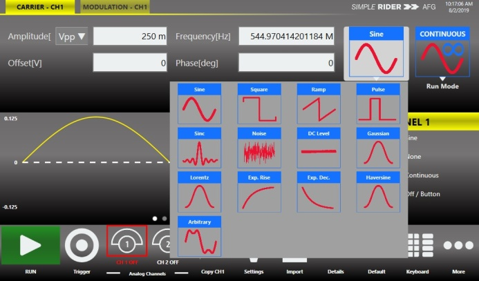 Новые генераторы АКИП сочетают в себе возможности генераторов произвольных и специальных форм, а так же генератор кодовых последовательностей. Комбинация пользовательских интерфейсов Expert Rider и SimpleRider позволяет быстро и легко создавать как простые специальный формы сигналов (синус, прямоугольник) так и сложные произвольные формы, а также различные виды модуляции. По умолчанию генератор запускается с интерфейсом SimpleRider. С интерфейсом SimpleRider, технологией DDS и большим сенсорным экраном диагональю 17,8 см генерация различных форм сигналов, модулирующих колебаний, режима качания сигнала по частоте, а также формирование пачек радиоимпульсов происходит максимально быстро.