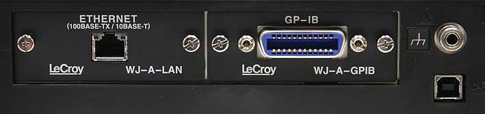 Дистанционное управление осуществляется по интерфейсу USB, расположенному на задней панели, что позволяет создать измерительную систему с возможностью удалённого управления и обработки результатов измерений на персональном компьютере. При установке одной из опций (WJ-A-LAN или WJ-A-GPIB) цифровыми осциллографами WaveJet 300А возможно управлять по локальной сети Ethernet или в системе КОП. Опции интерфейсов совместимы со всеми моделями WaveJet-A. Актуальные прошивки осциллографов (FW version), как и программное обеспечение удалённого управления и мониторинга, находятся в свободном для скачивания доступе на сайте корпорации LeCroy (ссылка).