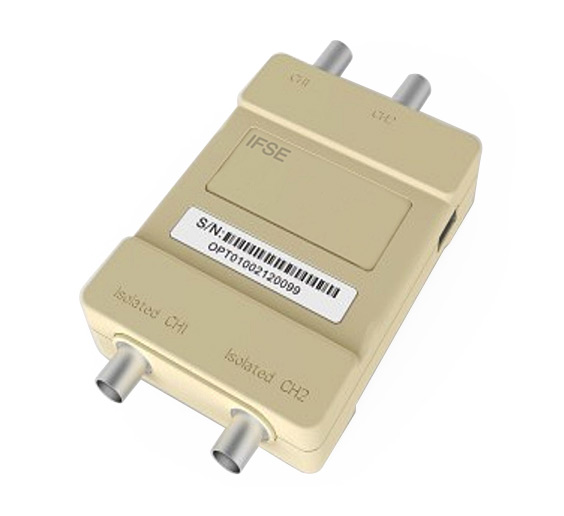 Модуль изоляции входов имеет универсальные разъемы BNC типа, что обеспечивает его совместимость в c входами передней панели осциллографа, а также практически со всеми типами современного измерительного оборудования: вольтметр, частотомер и др. Максимальное «плавающее» напряжение между каналами (без привязки к общему потенциалу земли) до 2000 Вскз. Рабочая полоса частот (полоса пропускания) составляет до 1 МГц.