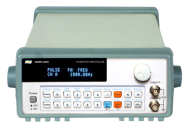 Модели АКИП-3302, АКИП-3303, АКИП-3304, АКИП-3305 оснащены двумя каналами. Второй канал имеет ограниченный диапазон выходных уровней. Приборы оснащены всеми необходимыми генераторам импульсов режимами: режим одиночных и парных импульсов, задержка относительно синхроимпульса и т.д. Генераторы являются синтезированными и могут работать от внешнего источника опорной частоты. Кроме этого модели АКИП-3304, АКИП-3305 имеют встроенный усилитель с отдельным выходом, который обеспечивает уровень сигнала на нагрузке 1 кОм до ±150 В. Опционально приборы могут оснащаться интерфейсами ДУ: RS-232, GPIB, USB, для включения в автоматизированные системы. Генераторы серии АКИП являются отличной заменой старым отечественным генераторам серии Г5-, приборы планируются к внесению в Госреестр.