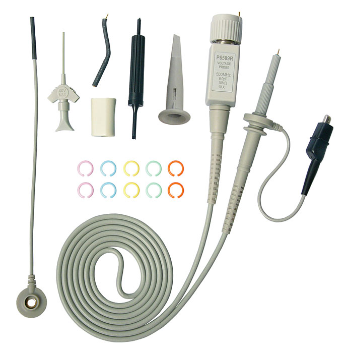 Новые высокоимпедансные пассивные осциллографические пробники Р-6509R, Р-6509R/Pro и Р-6501R, Р-6501R/Pro предназначены для использования с осциллографами, имеющими полосы пропускания до 500 МГц и входное сопротивление 1 МОм с ёмкостью до 20 пФ. Данные пробники при помощи встроенной схемы компенсации могут быть адаптированы для использования с приборами, имеющими другое значение входной ёмкости. Максимальное подаваемое напряжение до 600 В / кат I (до 300 В / кат.II).