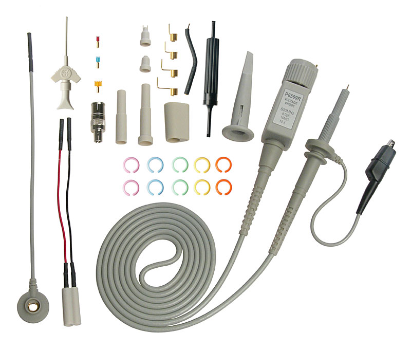 Пробники Р-6509R/Pro и Р-6501R/Pro имеют расширенный набор принадлежностей и аксессуаров. Например, так называемые «грабли» обеспечивающие надежное подсоединение к выводам интегральных микросхем и предотвращающие соскальзывание наконечника пробника с ножки микросхемы. При этом для микросхем с различным шагом выводов используются различные типы грабель, входящие в комплект. Для подключения к платам с высокой плотностью монтажа из комплекта пробников используются различные соединители, наконечники, изолирующие колпачки и адаптеры. Особого внимания заслуживает сменный соединитель-адаптер, обеспечивающий подключение наконечника пробника, содержащего входной и земляной контакты к игольчатым контактам разъемов или тестовых площадок. При необходимости на концах этого соединителя-адаптера можно подключить один или два миниатюрных зажима типа «шприц-крокодил» (при нажатии на головку соединителя на конце разжимаются контакты, при отпускании головки контакты сжимаются), что обеспечивает возможность подключения к выводам различных элементов – микросхем, резисторов, конденсаторов, трансформаторов, транзисторов и пр.