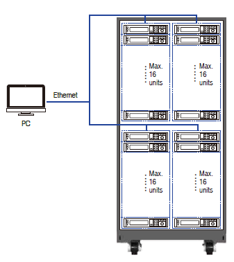 При объединении источники могут работать как независимо, так и синхронно. Объедение источников в единую многоканальную систему питания выполняется с помощью опционального интерфейса LAN и управляющего компьютера. Источники соединяются группами по 16 единиц. Например, в одной 19'' стойке высотой 37U можно объединить 64 источника (см. рис.1).