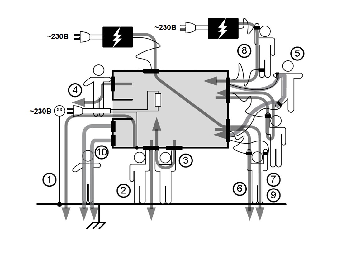 Определяет ток, протекающий через тело человека при контакте с корпусом устройства, и включает три сценария: «корпус – земля» №2, «корпус – корпус» №3 и «корпус – линия питания» №4. (Медицинское оборудование, ЭУ общего назначения) |