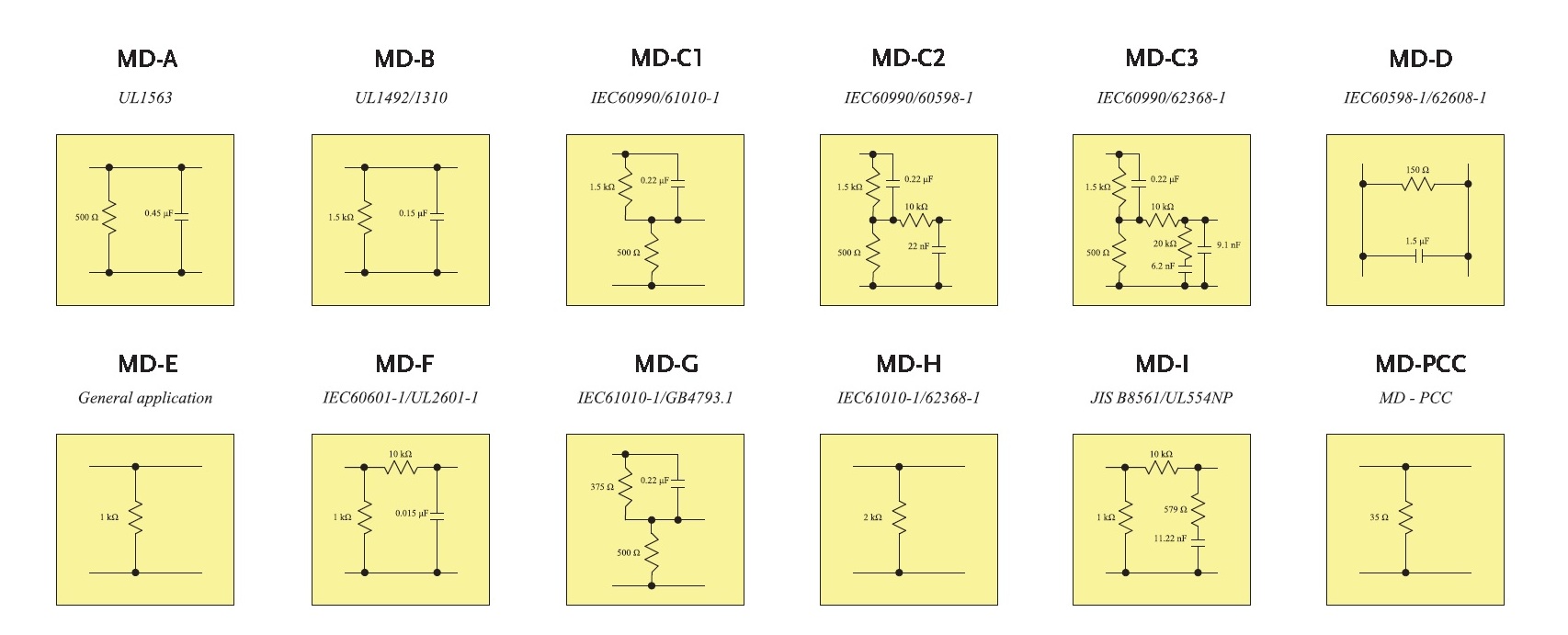 - 12 измерительных схем моделирования различных цепей сопротивления человеческого тела (включая IEC 60601-1:2020 версия 3.2)