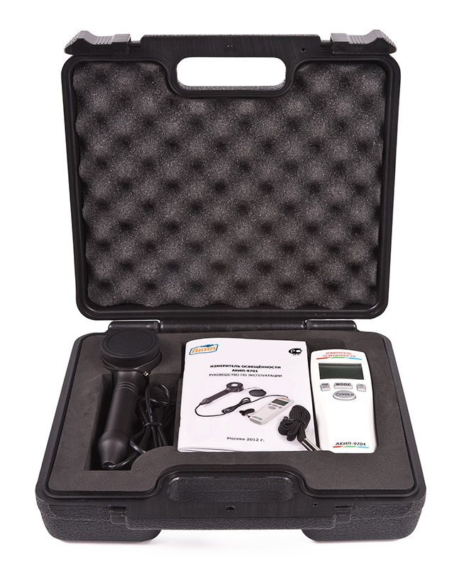 Конструктивно измеритель АКИП-9701 состоит их двух основных частей: цифрового измерительного блока с размерами 14×5×3 см и выносного оптического блока. Сенсор измерителя представляет собой сферический светоприемник на базе кремниевого фотоэлемента со съемной защитной крышкой. Сенсор-датчик соединен с измерительным блоком кабелем длиной 1м. Общая масса прибора всего 179 г.