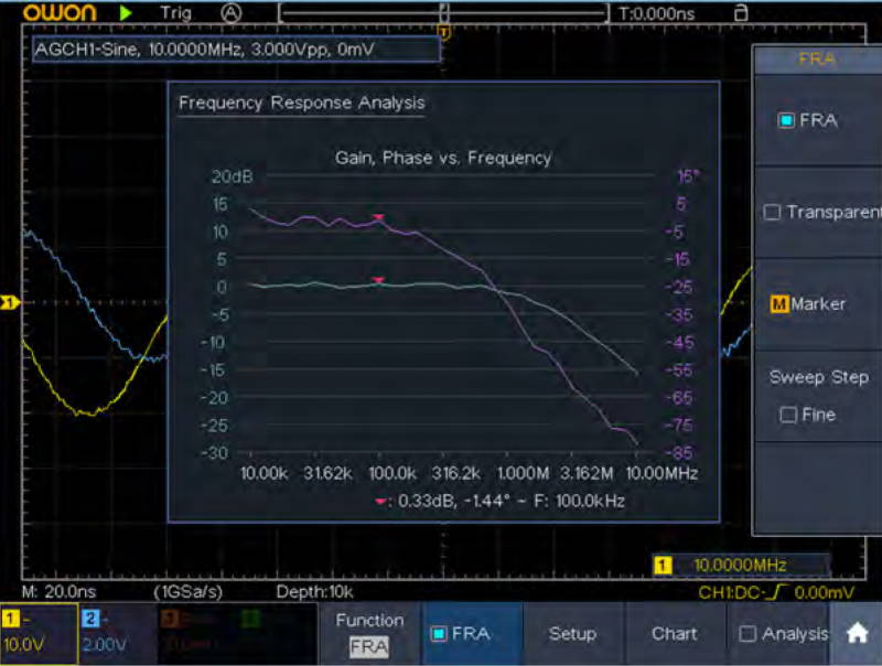 Осциллографы серии АКИП-4136 позволяют прокачивать сигнал по частоте указанного диапазона с помощью встроенного генератора сигналов и собирать данные на входе осциллографа для построения кривой АЧХ.