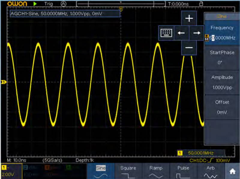 - Формы сигнала: синус, прямоугольник, импульс, пила + 46 встроенных сигналов произвольной формы
