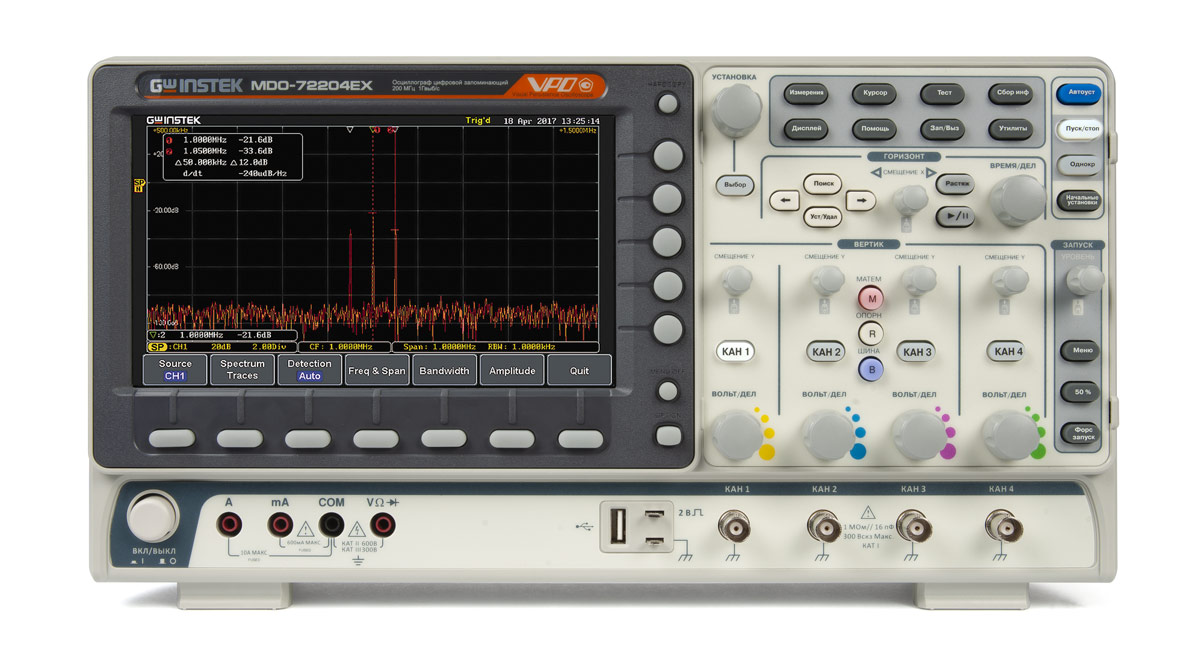 - Реальная многофункциональность. Приборы данной серии – это осциллографы, анализаторы спектра, 2-канальные генераторы сигналов, 2 канальные источники питания постоянного тока (MDO-72000EX), цифровые мультиметры (MDO-72000EX).