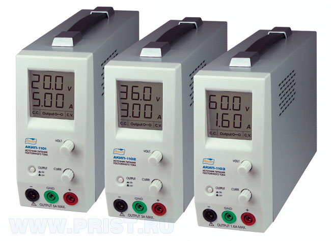 - АКИП-1101, АКИП-1102, АКИП-1103 - импульсные источники питания постоянного тока (80 Вт - 20/36/60 В; 5/3/1,6 А);