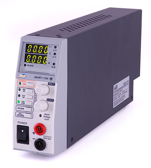- АКИП-1104 - импульсный источник питания постоянного тока программируемый (80 Вт - три диапазона: 16 В/5 А, 27 В/3 А, 30 В/2,2 А);