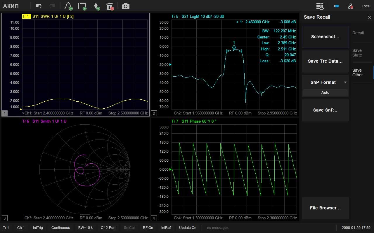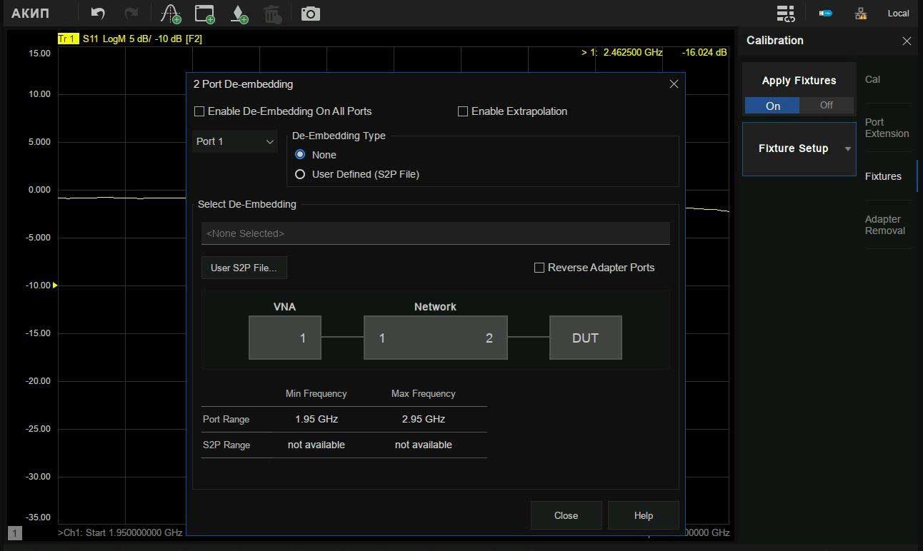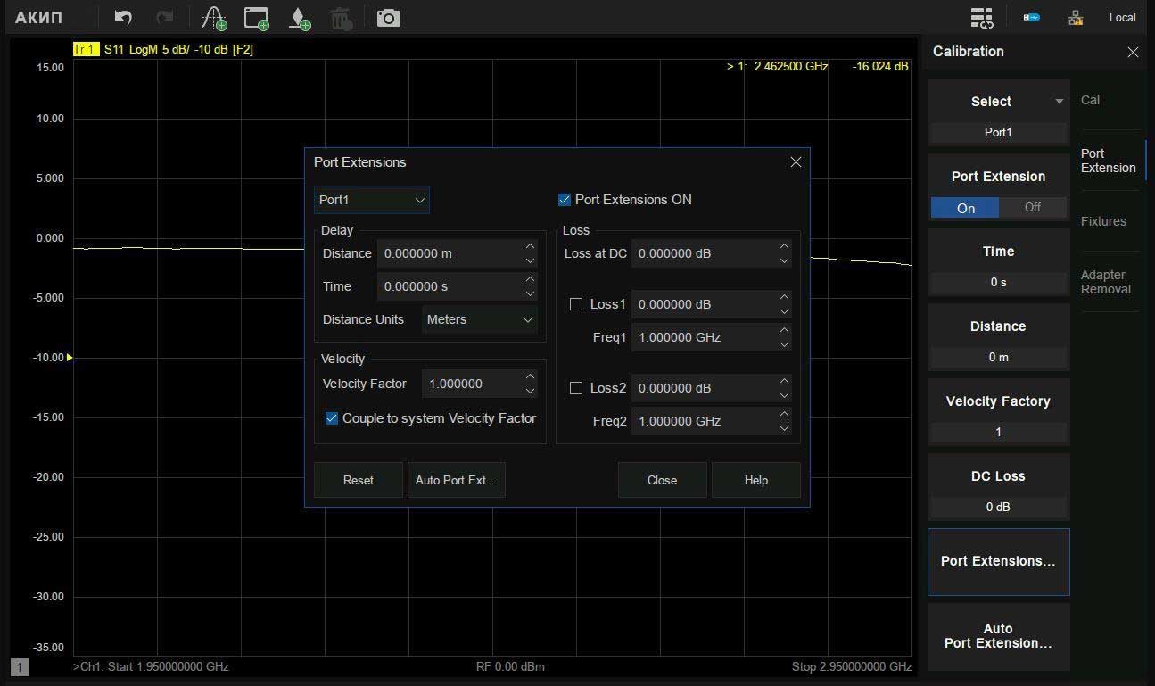 - Различные виды калибровки: простая, расширенная, полная (от одного до четырех портов), TRL-калибровка (SOLT, SOLR, TRL)