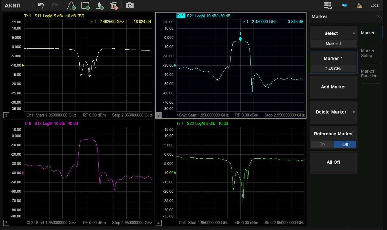 Анализаторы цепей серии АКИП-6604 представляют собой эффективные инструменты для вычисления добротности (Q-фактор), полосы пропускания и вносимых потерь фильтра. Они поддерживают возможность добавления (моделирования) или удаления измерительных оснасток, функцию допускового контроля и тестирование пульсаций. Анализаторы цепей серии АКИП-6604 также поддерживают различные виды калибровки и коррекции при измерении S-параметров: SOLT, SOLR, TRL, и расширенная калибровка для повышения гибкости в исследованиях, разработках и в производственных приложениях.
